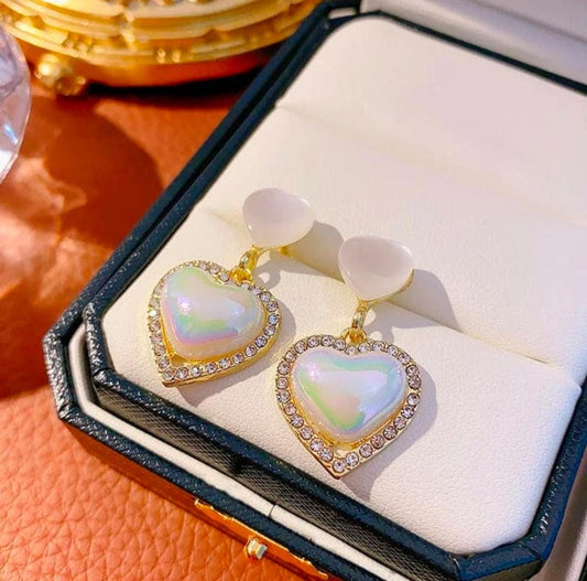 Iridescent Heart Drop Earrings – Pearl Shine with Crystal Halo