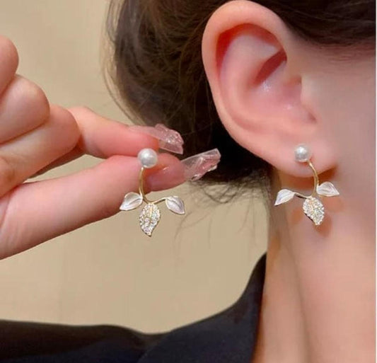 Golden Leaf Pearl Earrings – Nature-Inspired Crystal Studs