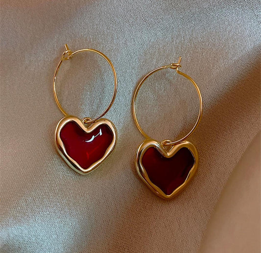 Golden Love Hoop Earrings – Red Enamel Heart Charms