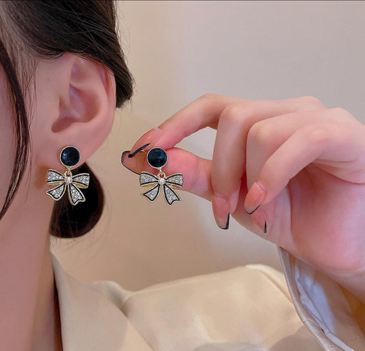 REINA Gold Bow Crystal Stud Drop Earrings - Elegant Rhinestone Dangle Jewelry